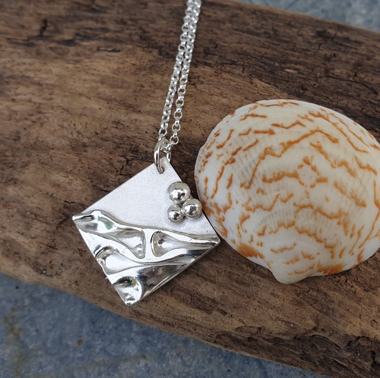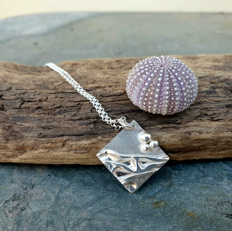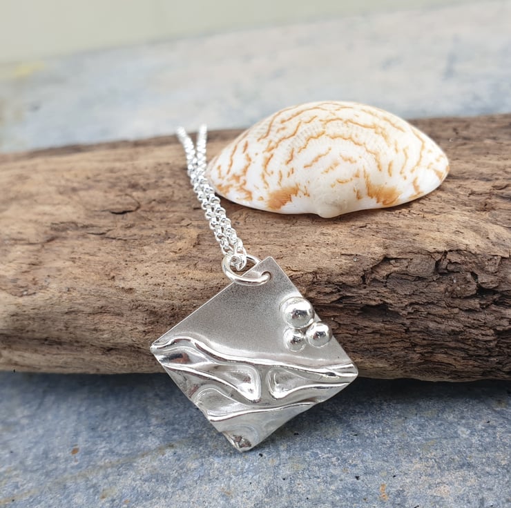 Inspired by my love of the sea, and walks along the shore, this diamond shaped pendant is handmade in sterling silver. It has been textured on one half to look like sand with 3 tiny silver pebbles and has a layer of folded fine silver to represent the sea. It measures approx 19mm across and comes complete with a sterling silver belcher chain which fastens with a bolt clasp