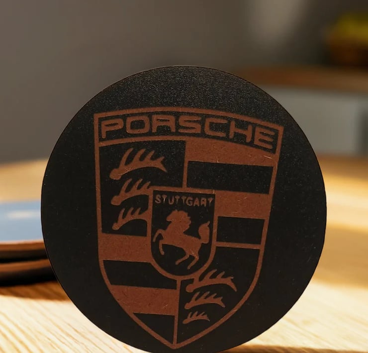 Set of 6 Iconic Car Logo Theme Wood Drink Coasters. Stylish and made to order. Round.