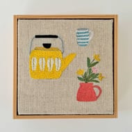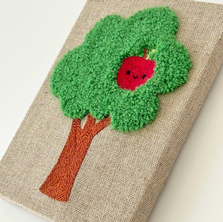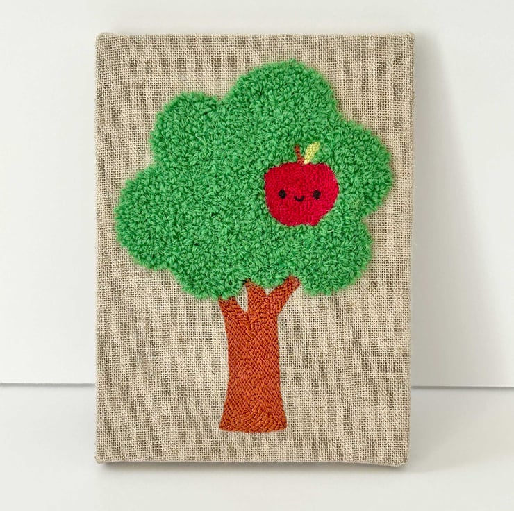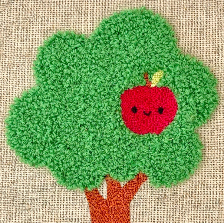 This is an original piece of Punch Needle art, featuring a happy apple in his tree. Hand embroidered by me onto Linen.