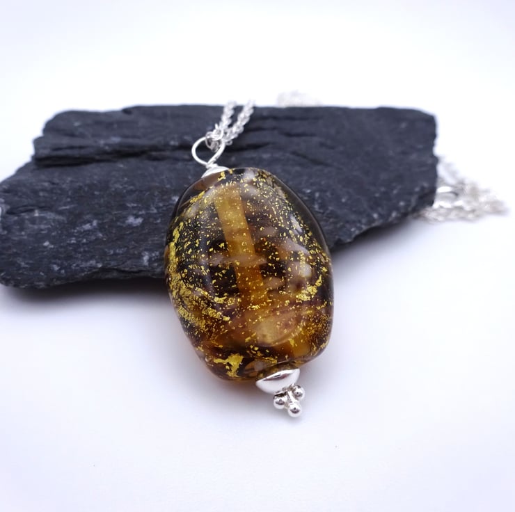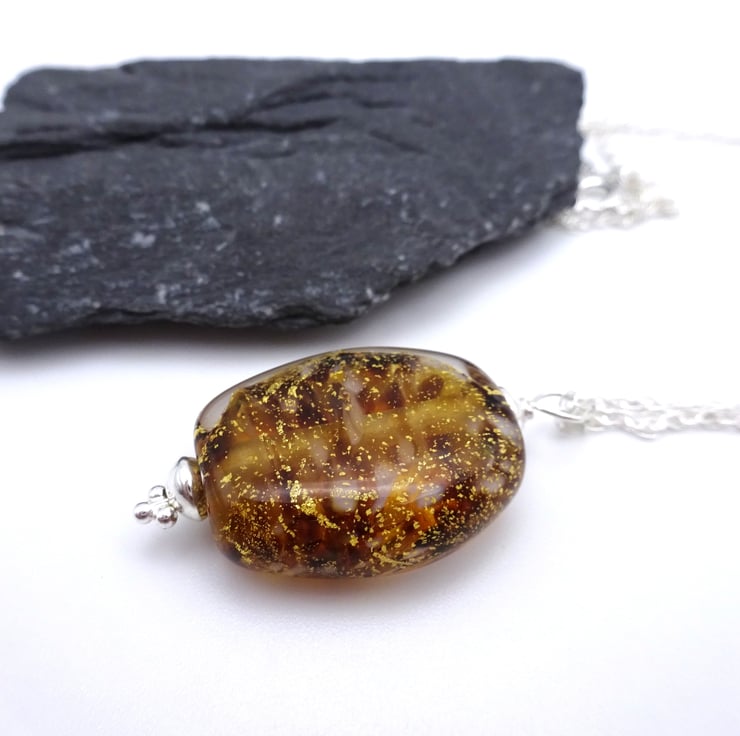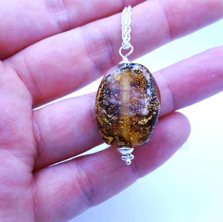 A lampwork glass pendant made with brown and white glass, it features gold leaf encased in clear glass.