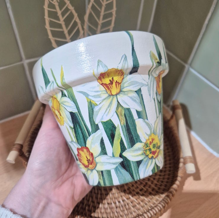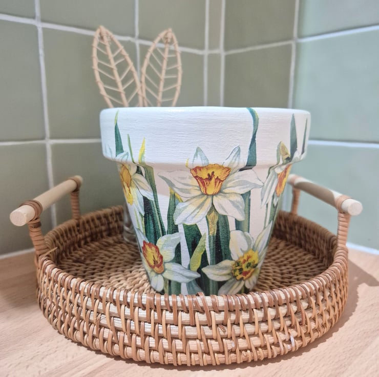 Beautiful handmade, decoupaged, spring plant pot. A perfect addition to your spring defor with its beautiful spring flowers. An ideal gift for mothers day or Easter!