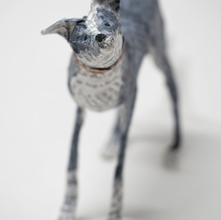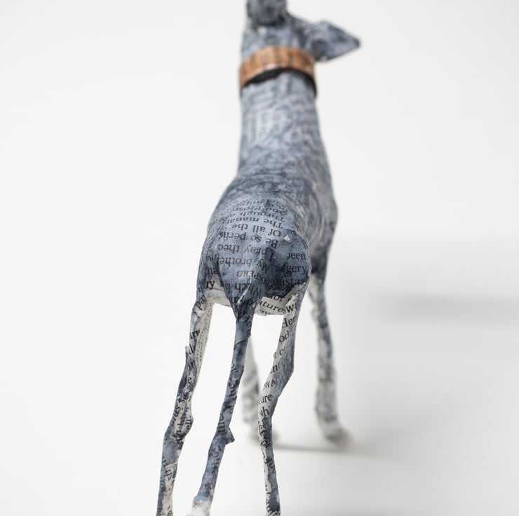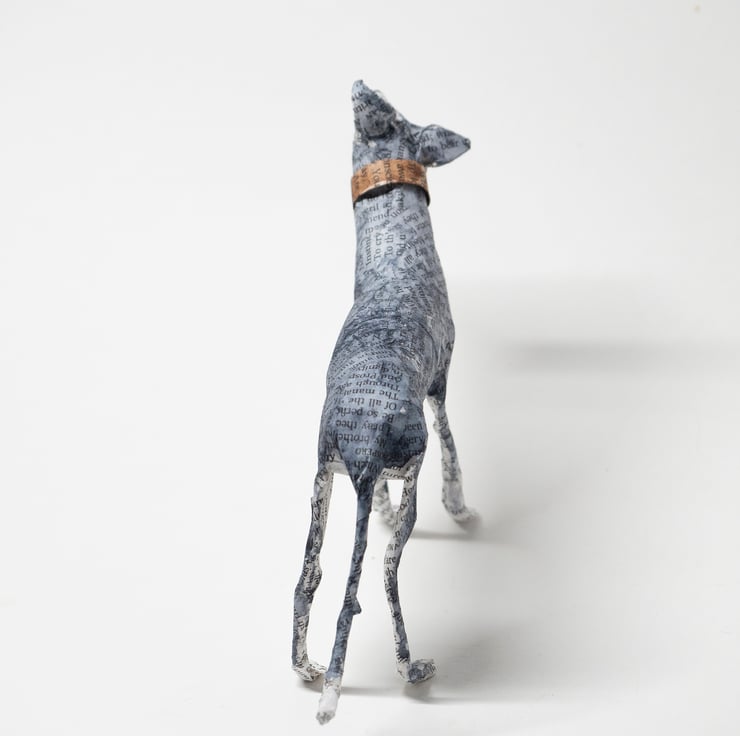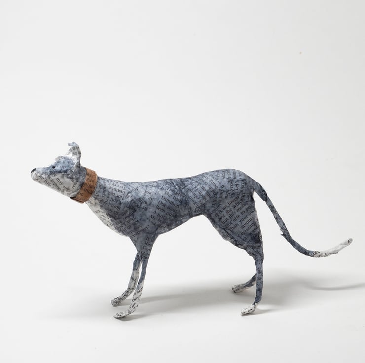 A handmade paper mache folk art sculpture of a small standing pointy dog. It is created from paper mache using book paper, wire and watercolour and is approx 11.5cm high x 19cm long.