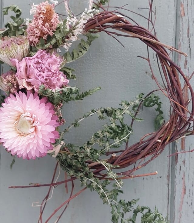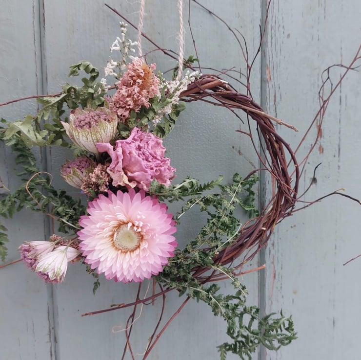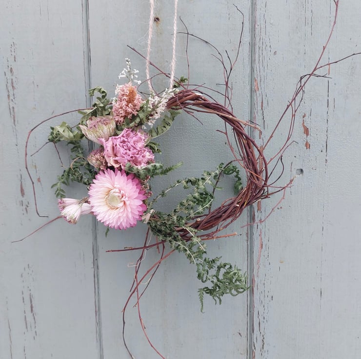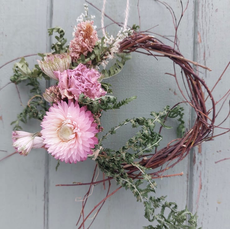 A handmade dried flower wreath decoration measuring approximately 10cm wide plus extra diameter from the twigs.