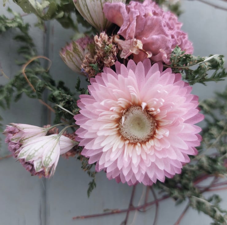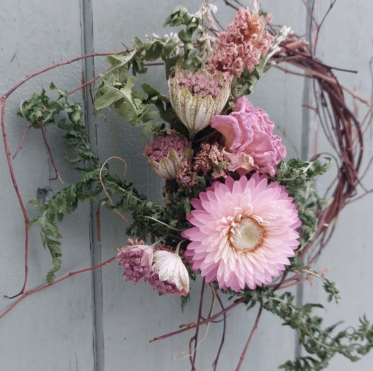 The flowers/foliage on this wreath include: Helichrysum, Fern and Astrantia.
