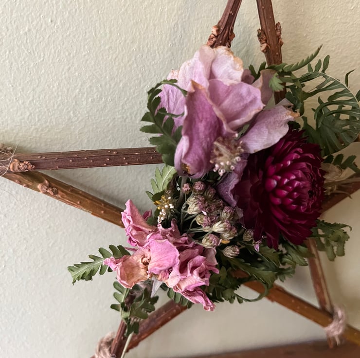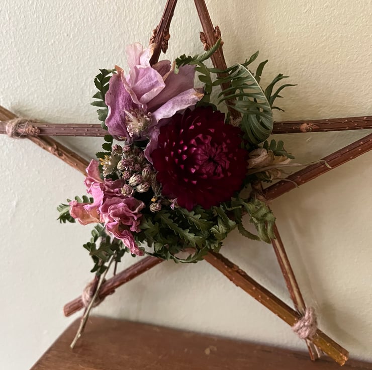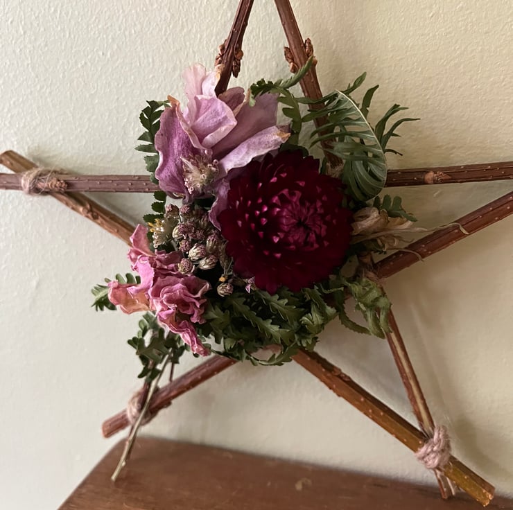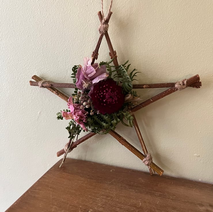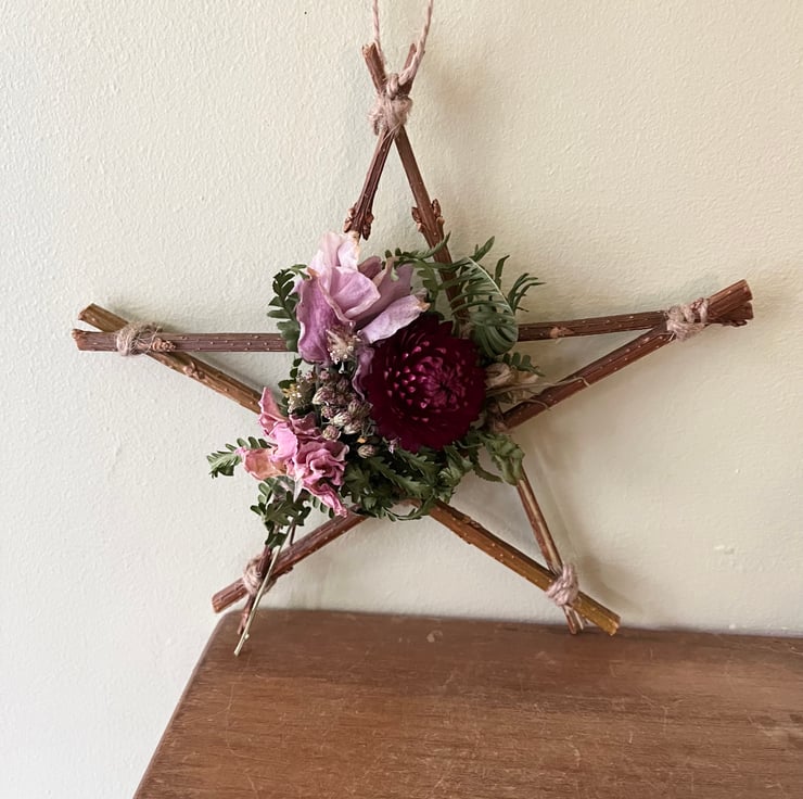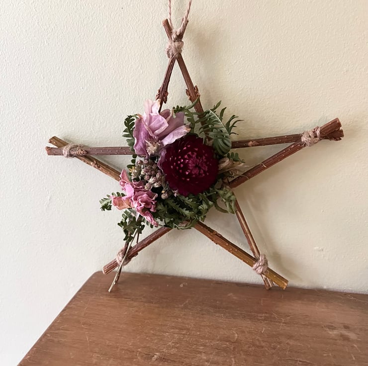 A handmade dried flower star measuring approximately 17x17cm at its widest points.