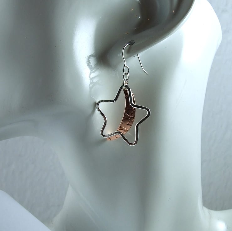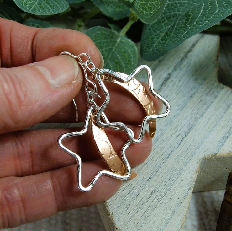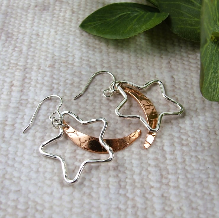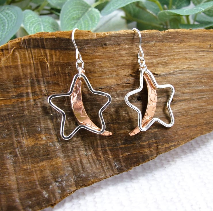 I have created the moon dropper shapes from copper sheet, hand cut and then textured with an embossed pattern. The stars are made from 1.2mm recycled sterling silver wire that I have shaped by hand into stars. Fitted to sterling silver ear hooks