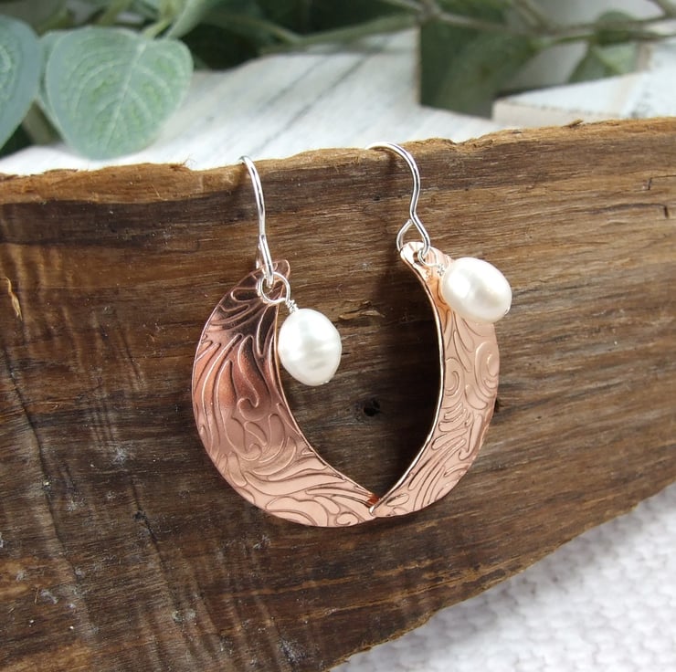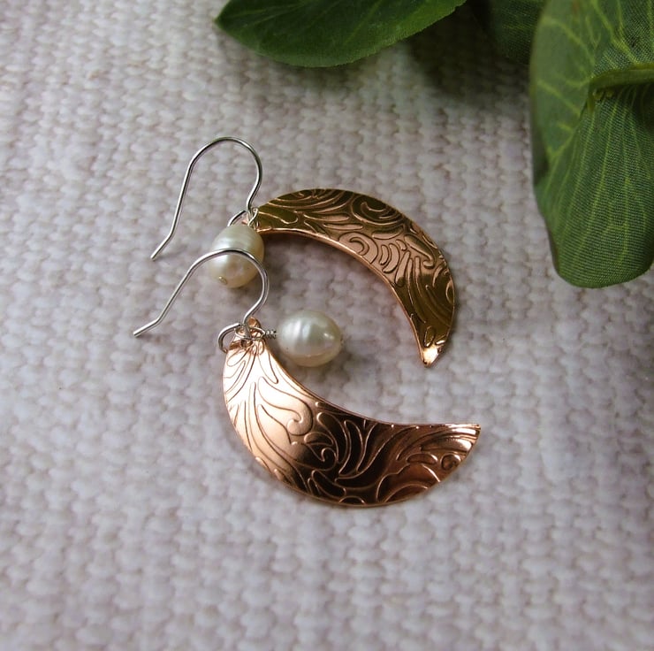 I have created the moon shapes from copper sheet, hand cut and embossed with a pattern. Alongside I have added some creamy pearls securely wire wrapped in place. Fitted to sterling silver ear hooks