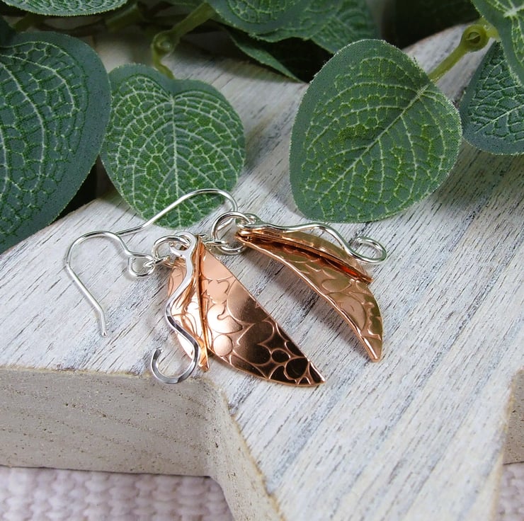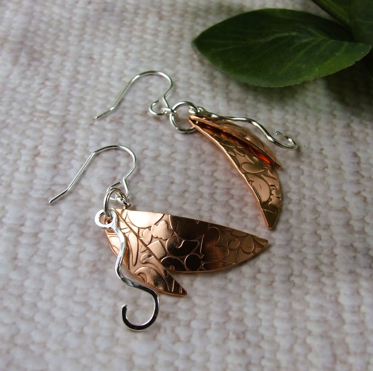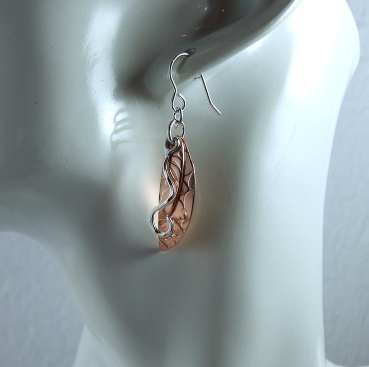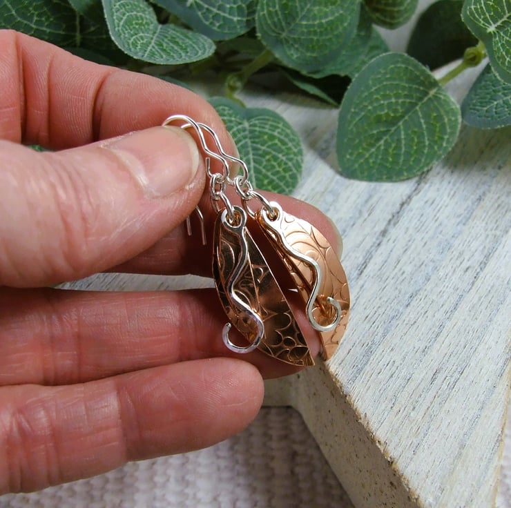 I have created the copper shapes from copper sheet, freestyle hand cut into leafy shapes and then textured with an embossed pattern. Alongside the copper I have added a wavy silver shape to add interest handmade from sterling silver wire. Fitted to sterling silver ear hooks