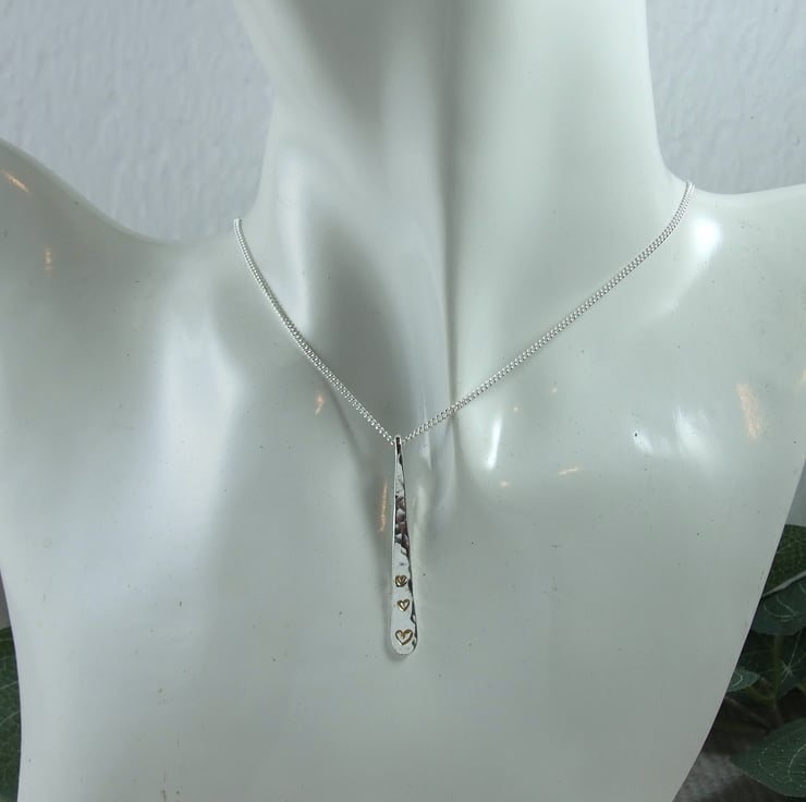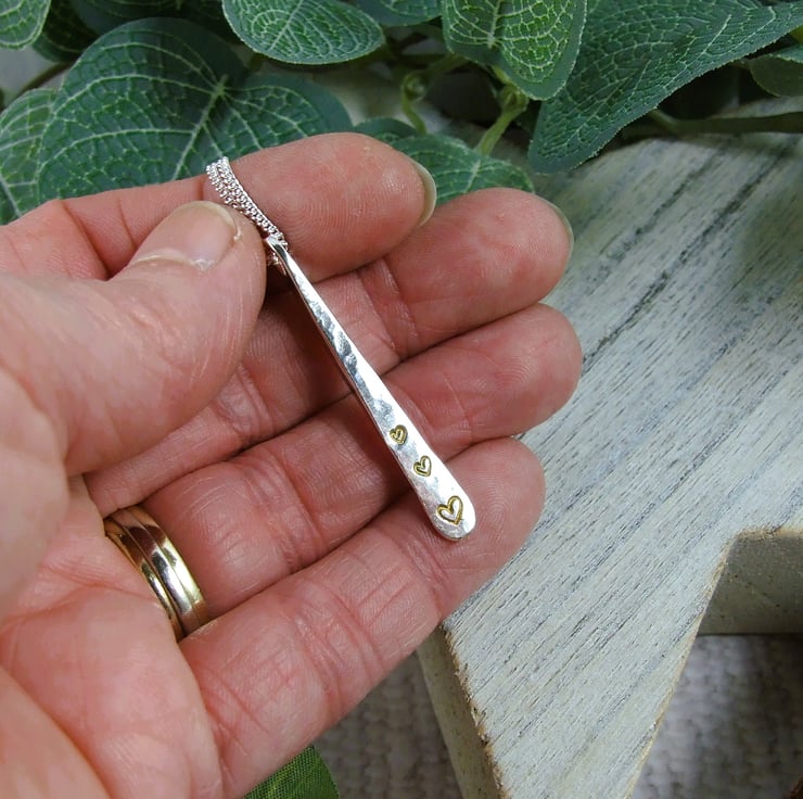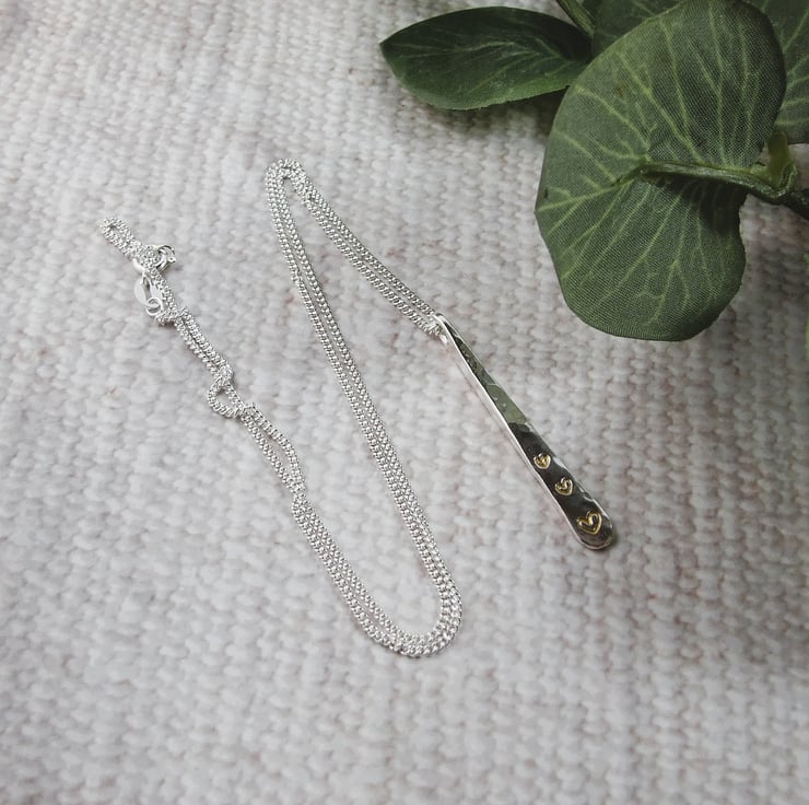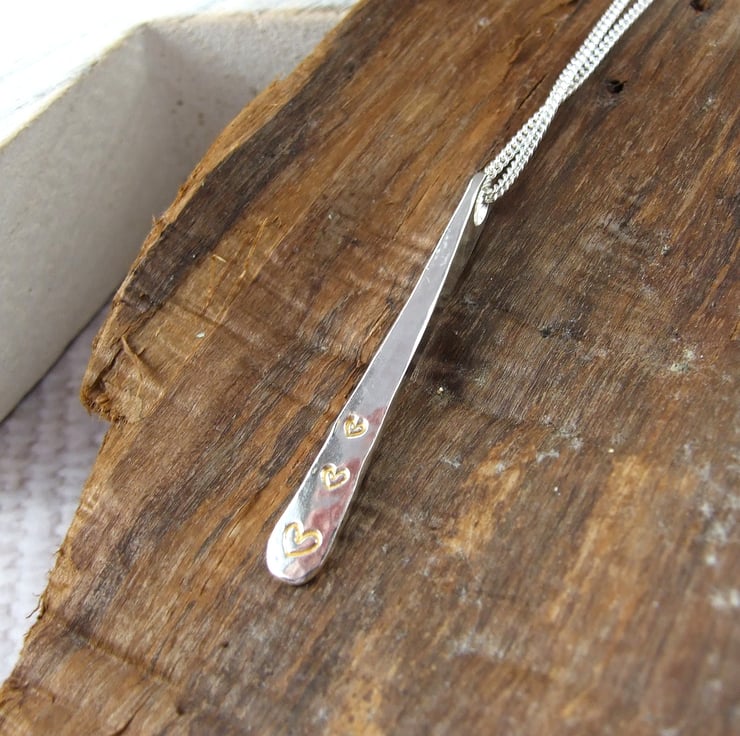 I have created the bar from 2.5mm sterling silver square wire, cut to size, drilled through, shaped into a teardrop and hammered for texture. At the bottom of the teardrop I have hand stamped three little hearts and filled them with gold coloured enamel. Fitted to an 18 inch .925 Sterling Silver chain.