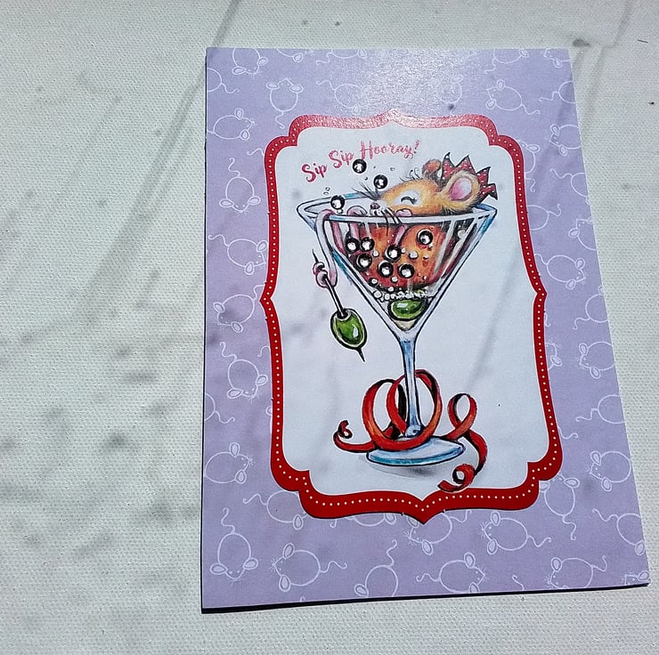 A tipsy mouse is sitting in a cocktail glass full of sparkly bubbles, singing sip, sip hooray.