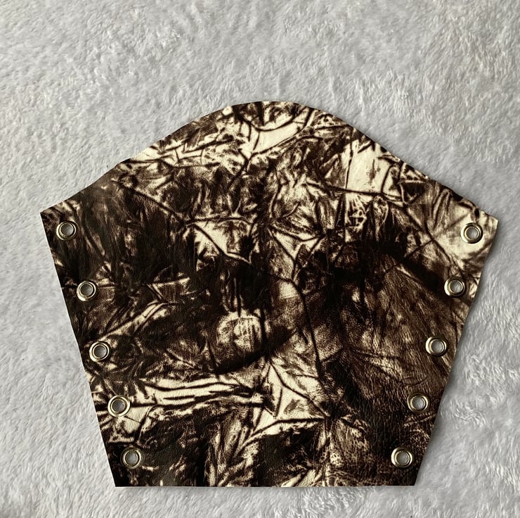 6" across the bottom, 10.5" across the top. 9" from top to bottom. Don't forget they will expand a bit after you put in the lacing. All bracers have nickel plated grommets. The leather is a soft, lightweight piece, roughly 1 oz in weight. All bracers come with lacing - - lacing colour will vary based on what is in stock to supply with the order