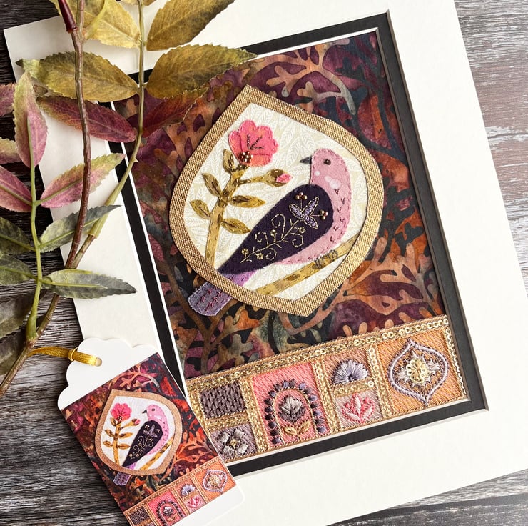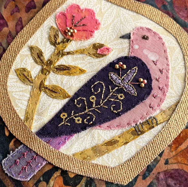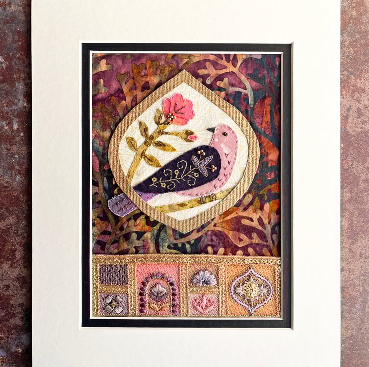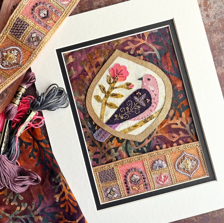 I've used a soft, muted palette of pinks and purples for this artwork. There's a pretty strip of Indian embroidered trim at the base and I've used batik fabric as the background. The folk bird is made using cotton and batik fabrics and has been embellished with metallic embroidery threads, seed beads and tiny sequins. The pomegranate shape surrounding the bird and flower has been cut from canvas and painted gold.