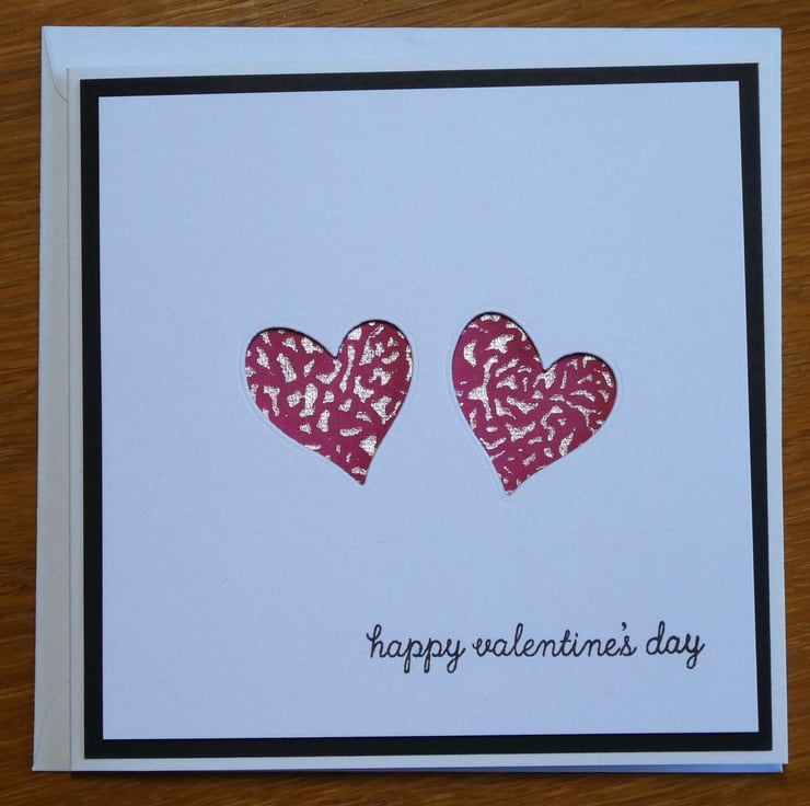 This simple and elegant valentine's card has a pink and silver handmade background paper which can be seen through two heart shaped apertures.