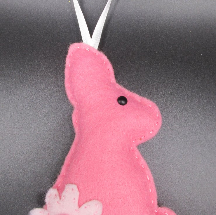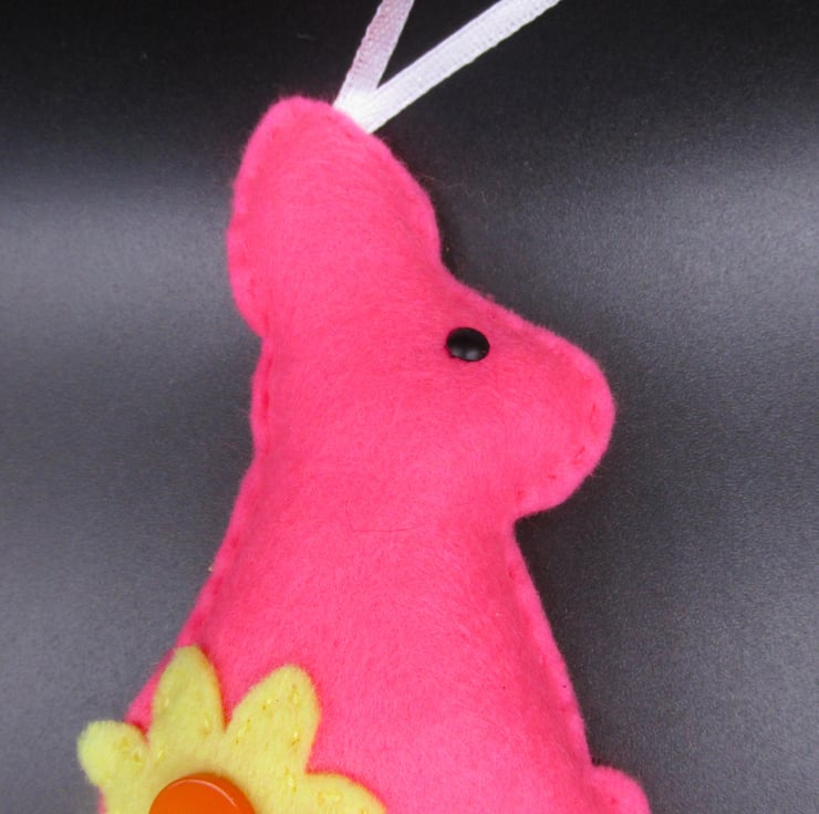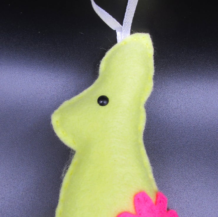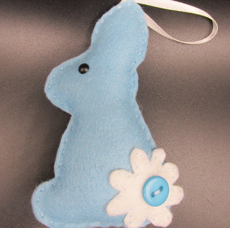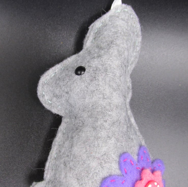 The rabbits are one sided, plain back, facing either left or right and measure approximately 4 inches tall (100mm) with a 2 inch (50mm) hanging loop. The decorations do contain buttons and beads/brads, which although sewn on securely, they should not be given to young children or babies to prevent possible choking hazard.