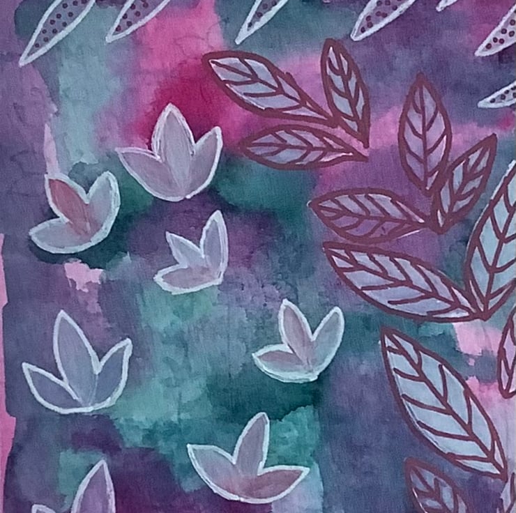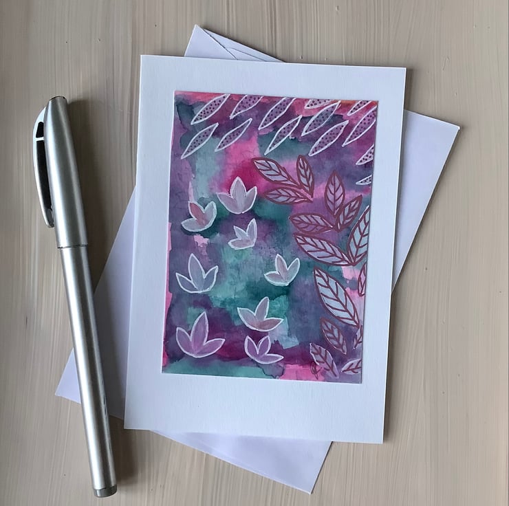 This is hand painted in Artist quality materials with a semi abstract background and frosty flower shapes, giving a feeling of the winter garden.