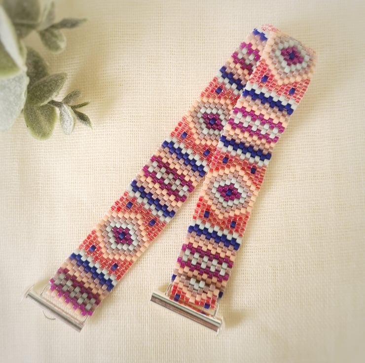 The beads are stitched together using strong, nylon thread with a Peyote stitch of my own design. It is finished with a stainless steel silver slide clasp for easy wear. The bracelet comes with a cute handmade pouch to store it in.