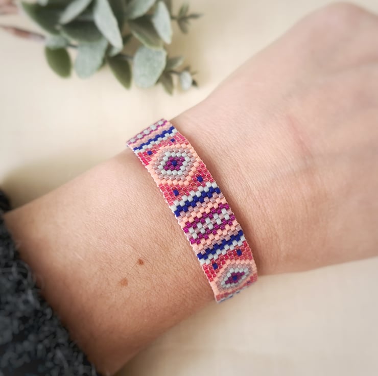 This unique bracelet was made using beautiful Japanese glass beads called Miyuki Delica. There is a mix of matt, luster and silver-lined beads and it beautifully catches the light when worn.