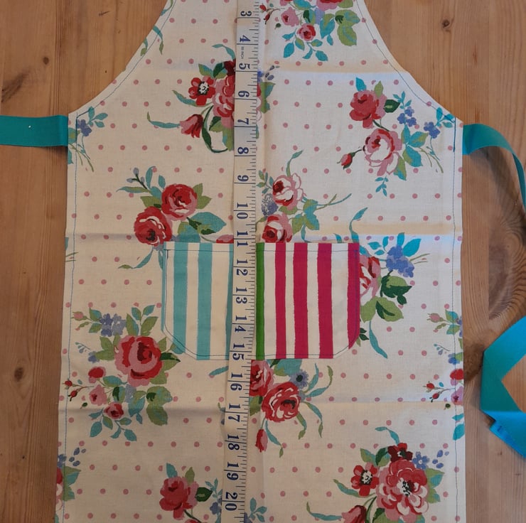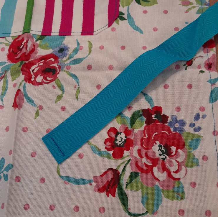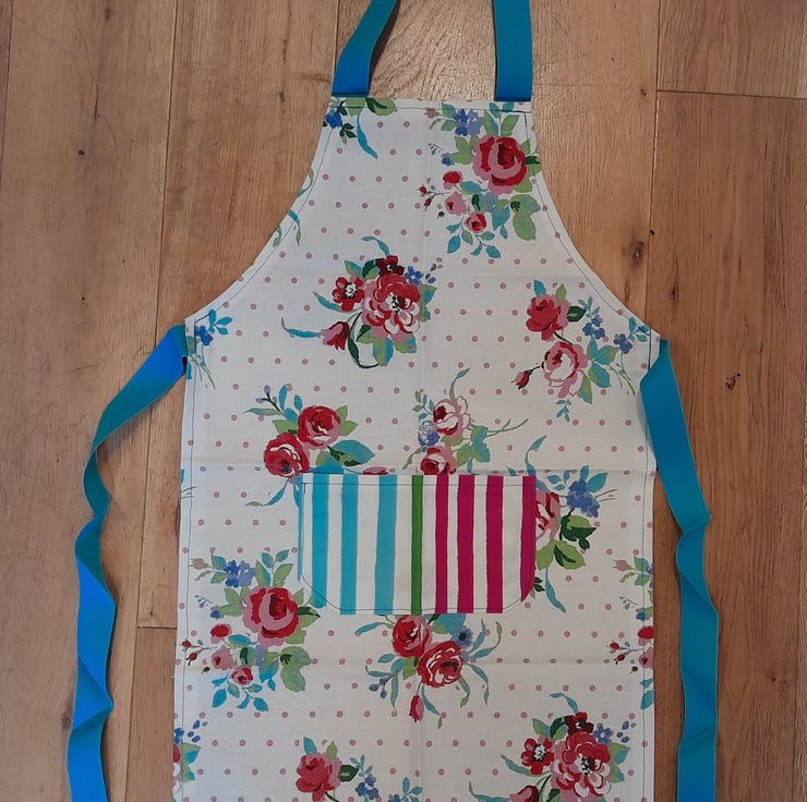 Bright and breezy kids apron, with a fresh turquoise and pink colour scheme, featuring a mix of floral and stripe prints.