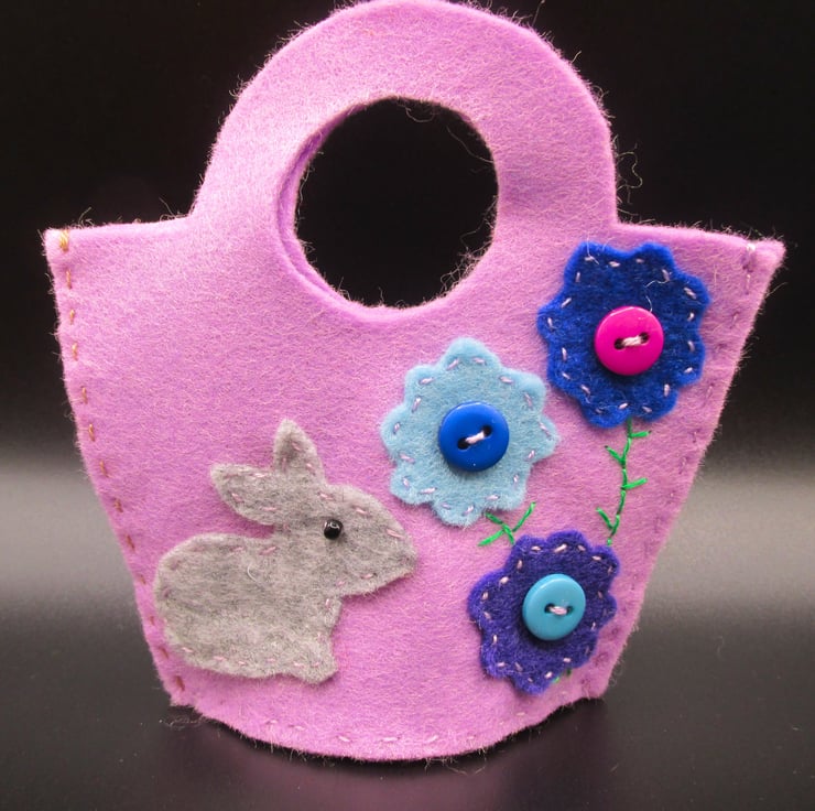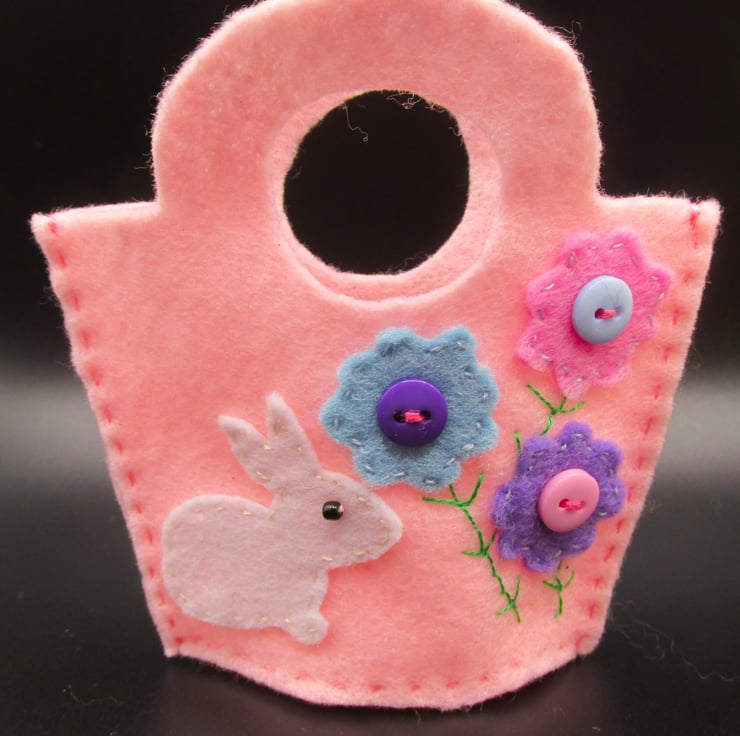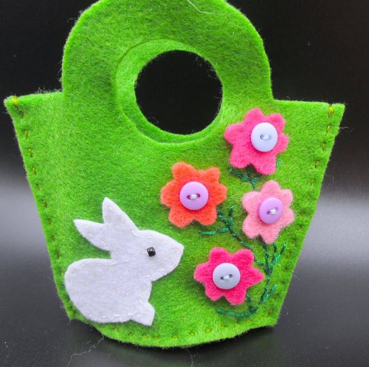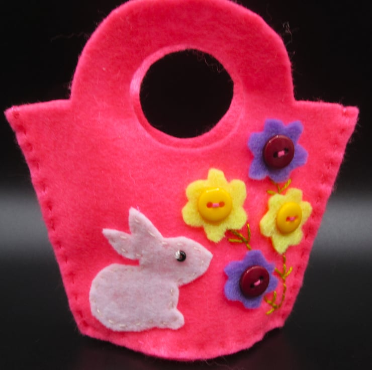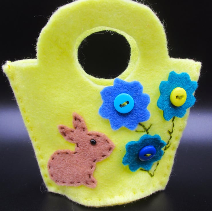 Please note these are not full size baskets, they are mini felt pockets which can contain the likes of mini eggs or other small sweets (not supplied). Hand made with felt and button decorations. The baskets measure approx 90mm x 90mm (3 1/2 inches) and could be hung on an Easter tree or given as a small gift.