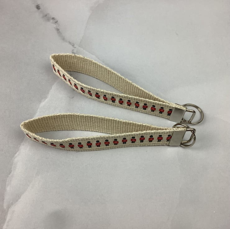 Handmade fabric key fob with a fun guardsmen ribbon backed by a choice of coloured cotton webbing.