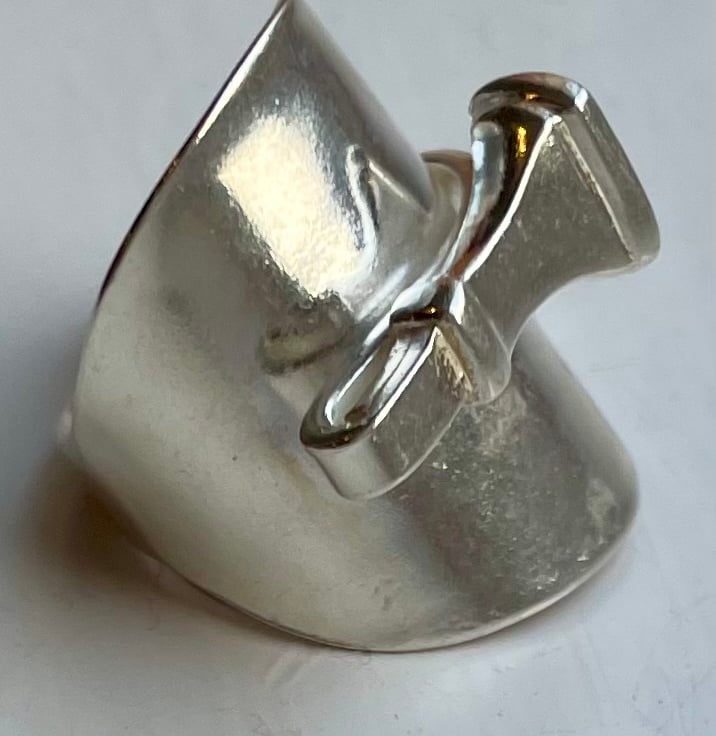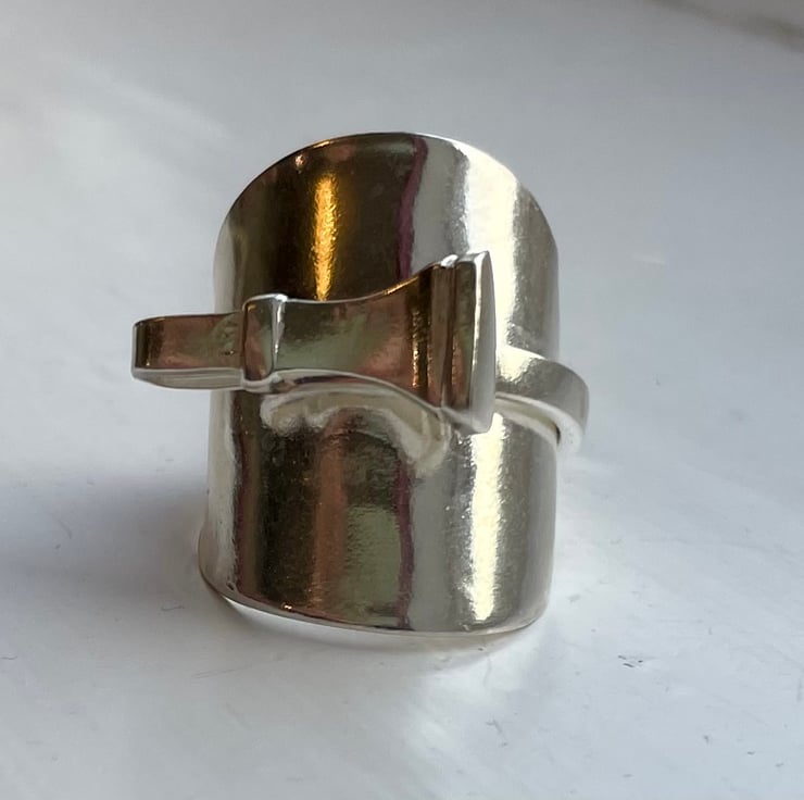 This ring is made from a solid silver coffee spoon. It is a UK size P but can be adjusted so please contact me if you need a different size. Both the original hallmark and the new hallmark are on the inside of the ring, on the underside of the flattened bowl. The spoon handle has been bent over to create a raised design, so is quite a statement price but is very comfortable to wear.