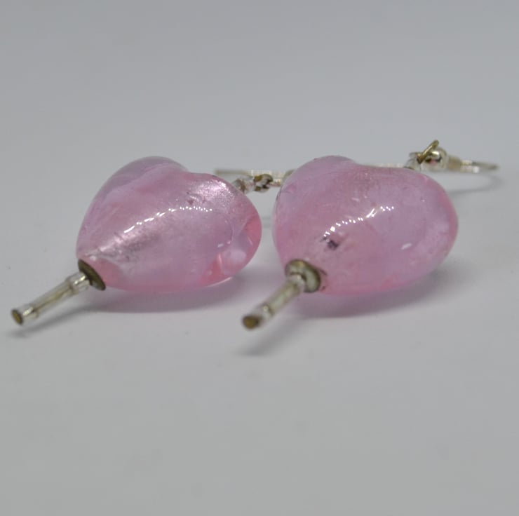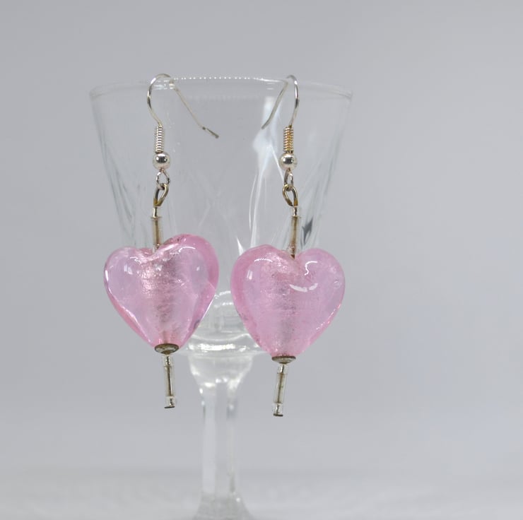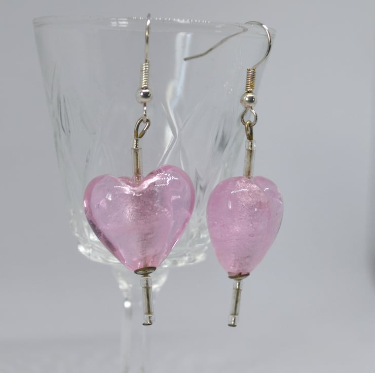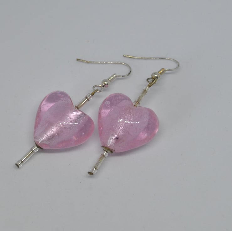A pair of silver lined pink glass earrings with silver lined bugles and seed beads on silver plated findings. They have a drop of approx. 3.7cm from the base of the ear wires.