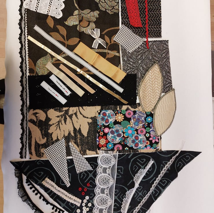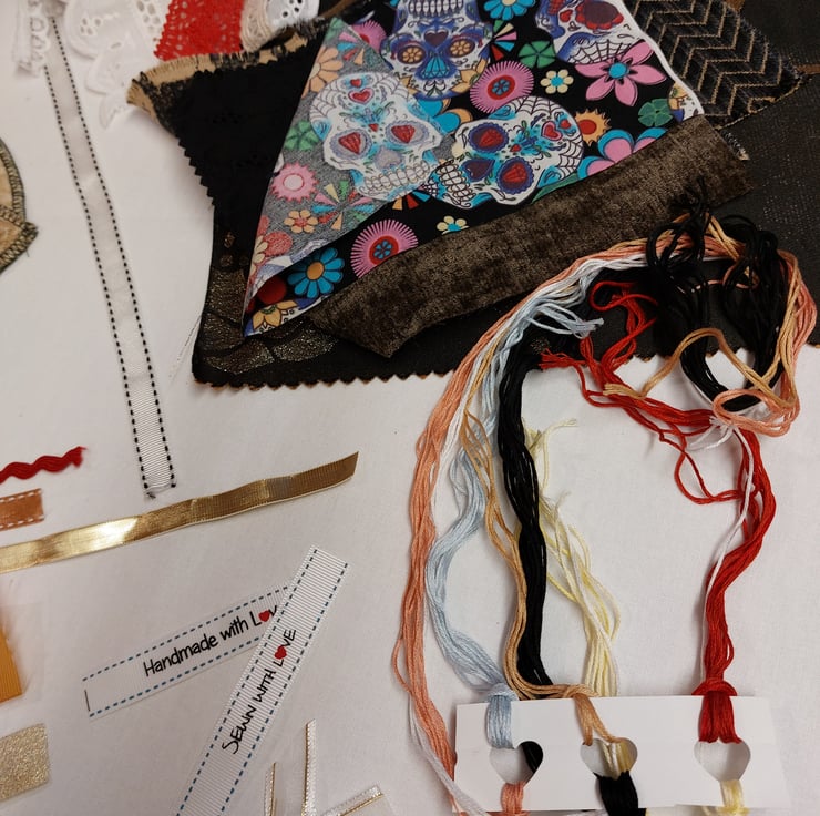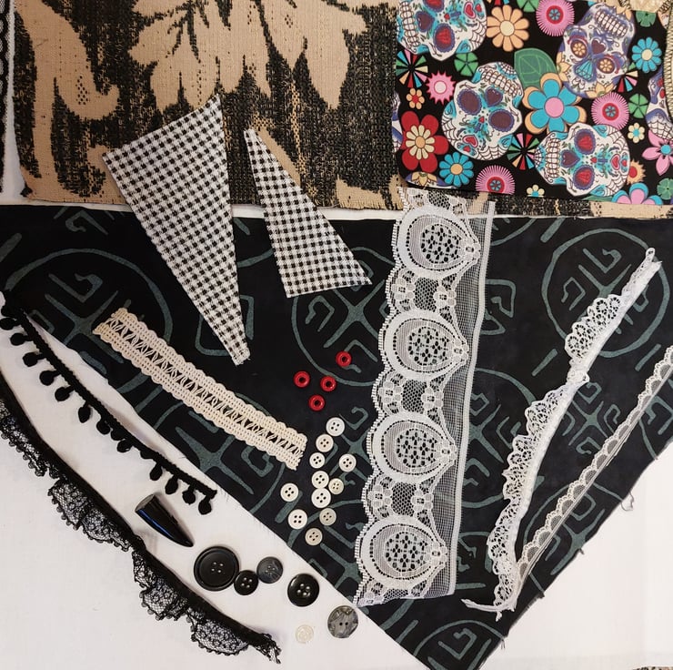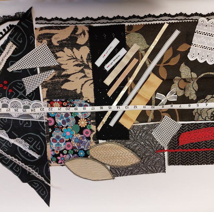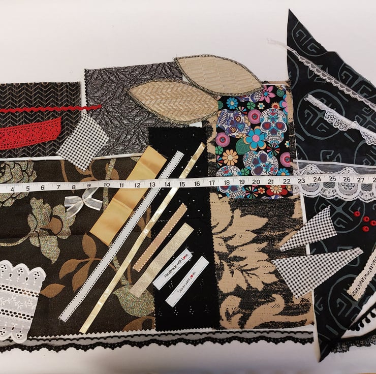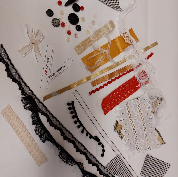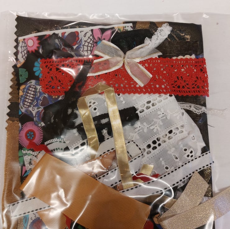 mixture of 8 fabrics ranging from 11 x 13 inches to 7 x 4 inches, laces, buttons, trims ribbons and embroidery threads included plus made with love labels.