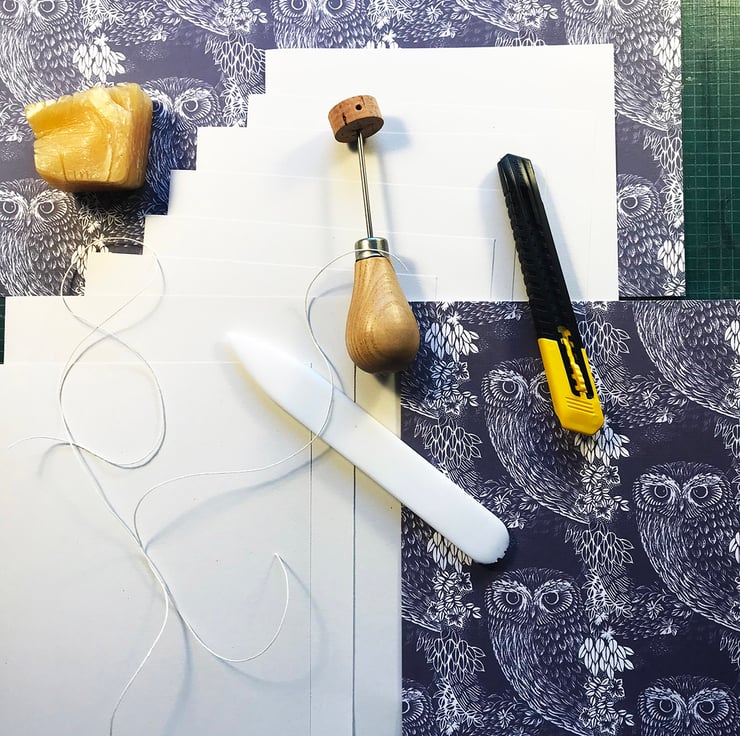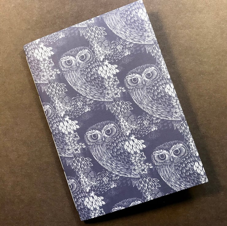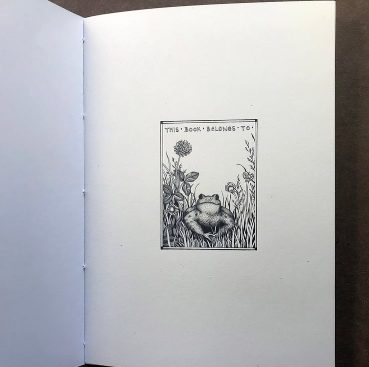 32 page blank notebook, journal or sketchbook, entirely designed and hand bound by the artist. The decorative cover has been printed onto a linen effect card, inside there are 32 pages made from 140gms recycled cartridge paper. The first and last page feature a small artwork, one an ex libris label and one the artists's logo, all other pages are blank. The book has been hand bound and stitched with waxed linen thread.