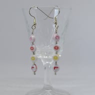 A lovely pair of light weight earrings made using acrylic flat round purple beads with the word "love" written in it, plus acrylic pink bicones and silver lined glass seed beads. The earrings have a drop of approx. 3.3cm from the base of the silver plated ear wires.