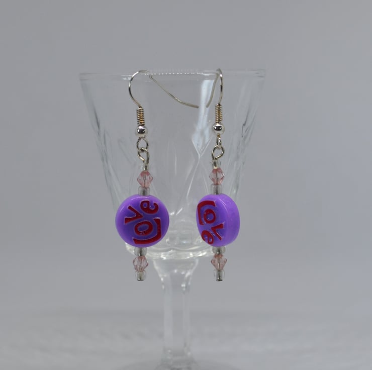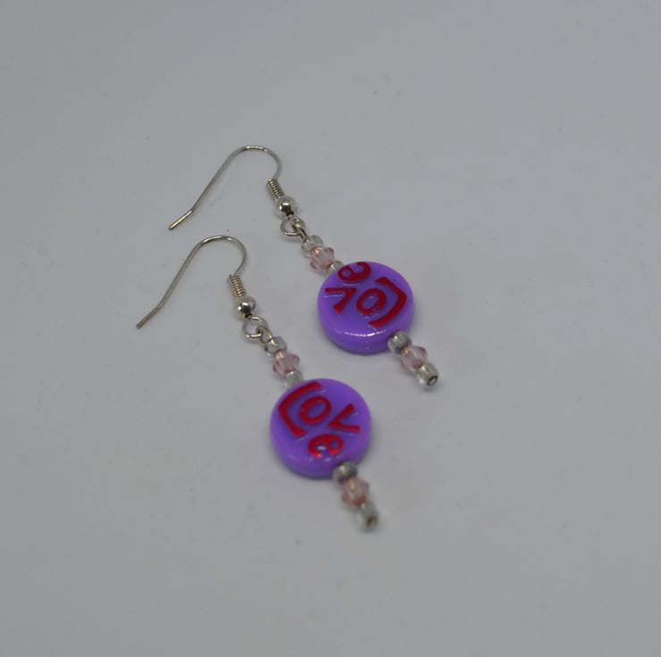 A lovely pair of light weight earrings made using acrylic flat round purple beads with the word "love" written in it, plus acrylic pink bicones and silver lined glass seed beads. The earrings have a drop of approx. 3.3cm from the base of the silver plated ear wires.
