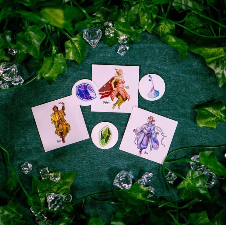 The Aetherian Sticker Pack brings magic to life with stickers of the three Aetherian guardians—Aura, Zephyra, and Dion—two enchanting Aetherian gems, and the whimsical Floredent plant. Perfect for personalizing notebooks, laptops, or any space you want to make a little more magical.