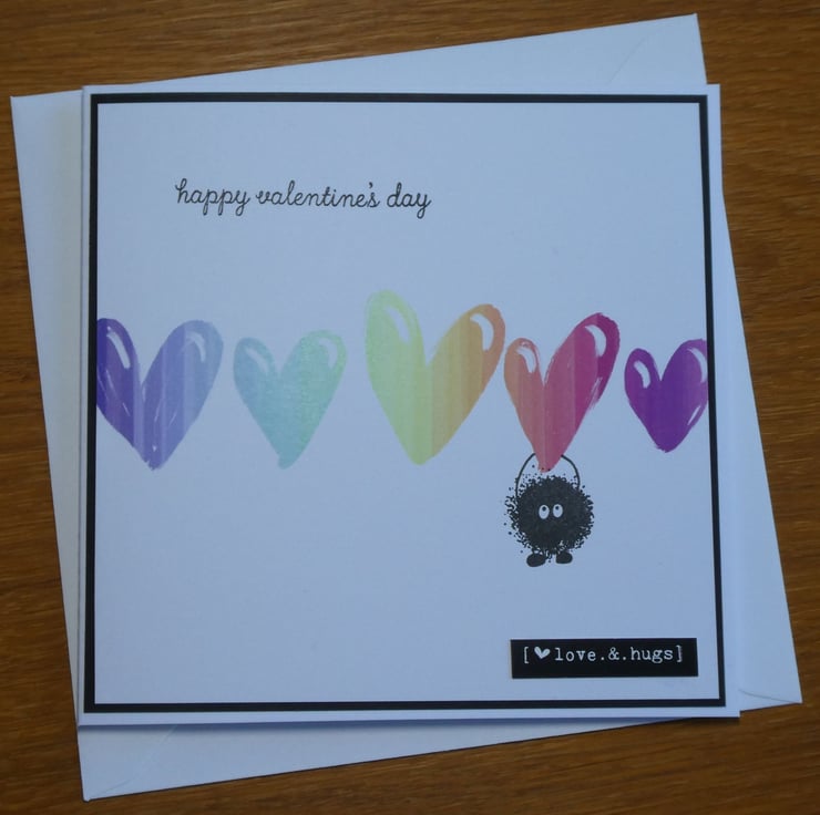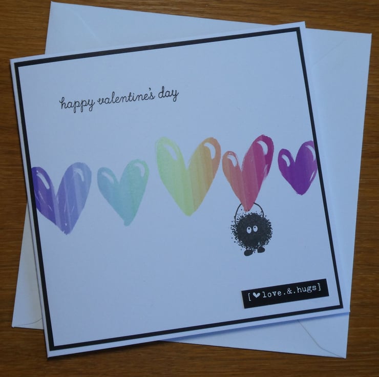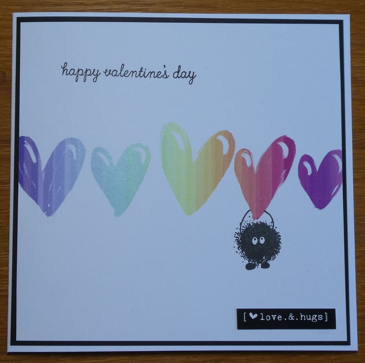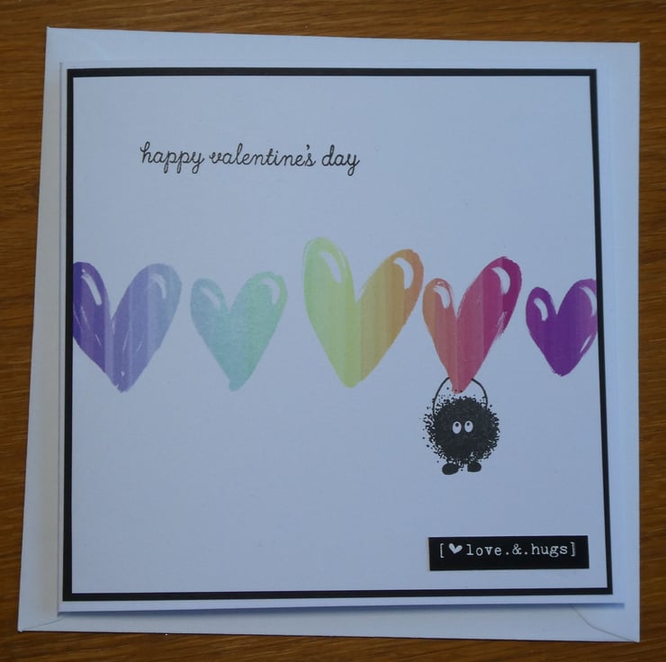 This valentine's card has a printed background paper with a row of bright rainbow coloured hearts.