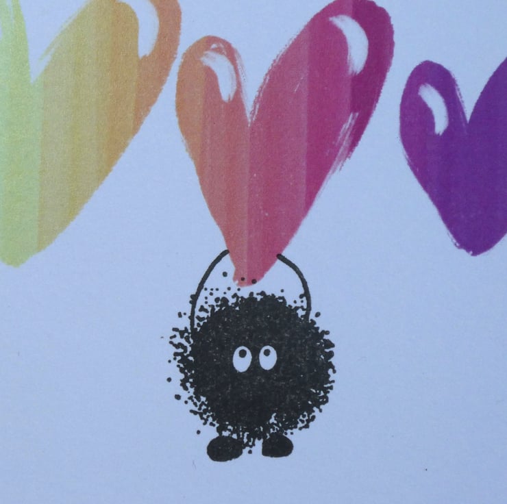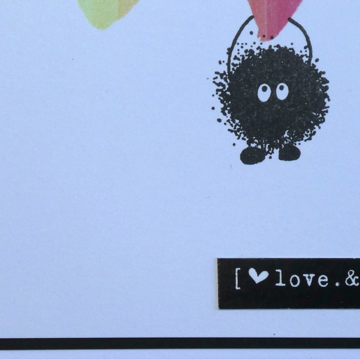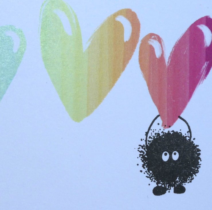 A cute 'love bug' has been hand stamped in black archival ink, positioned to look like it is holding one of the hearts above it's head in both hands.