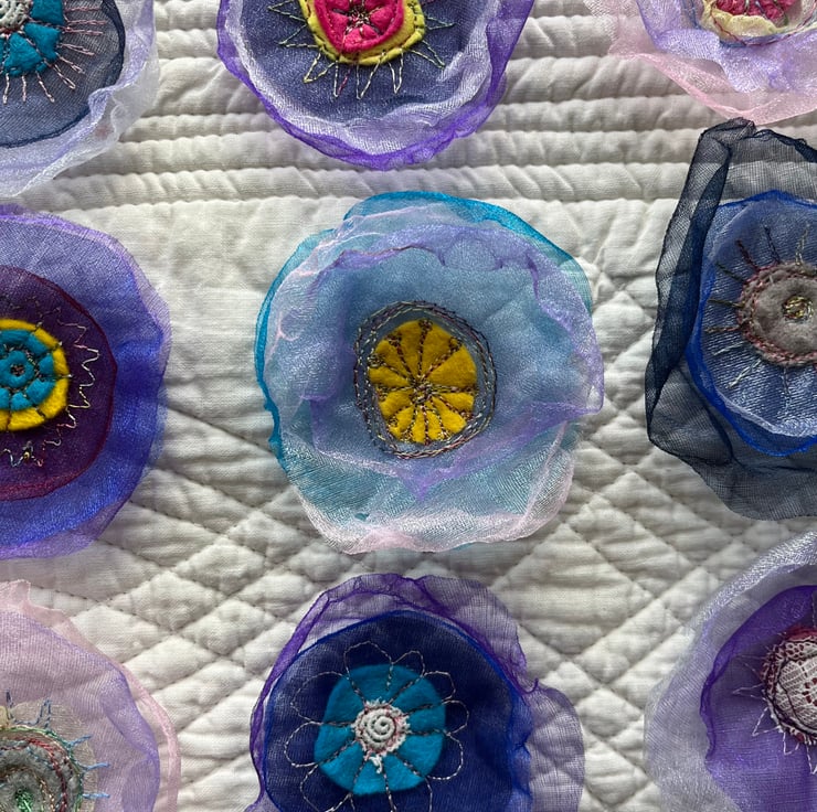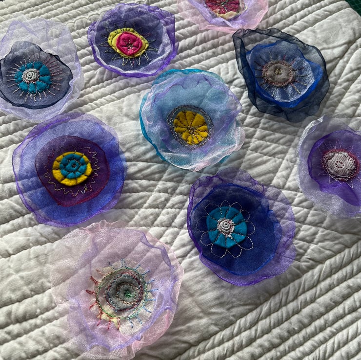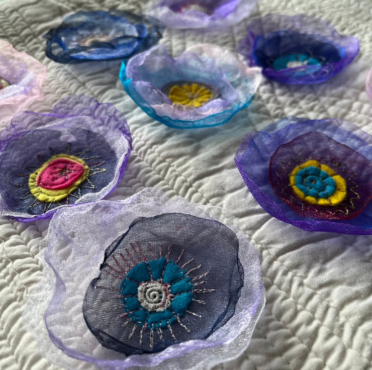 Each one is made of 3 layers of organza, a centre of felt and embroidery thread which has been free motion embroidered to add detail. Some have a centre of a circle of lace to add interest and detail.