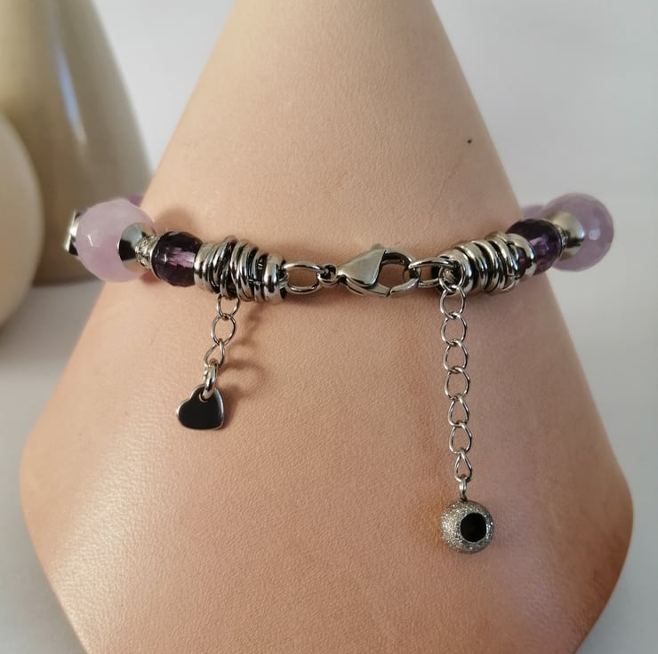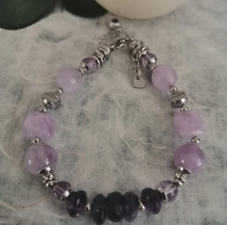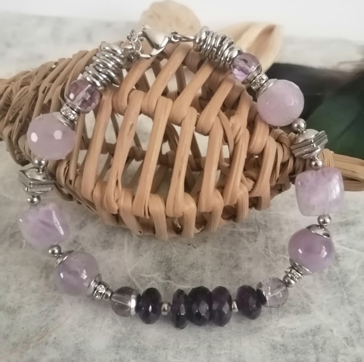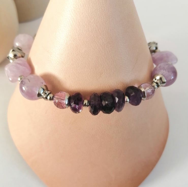This bracelet has a creative mixture of shapes, textures and colours of natural amethyst. I enjoyed designing this piece and seeing how each bead is unique.