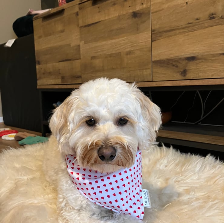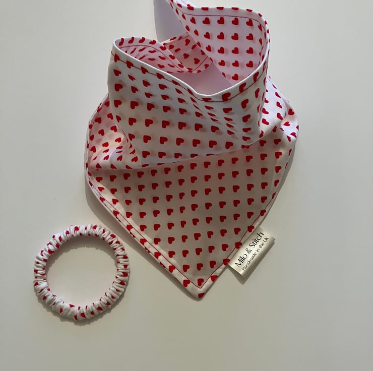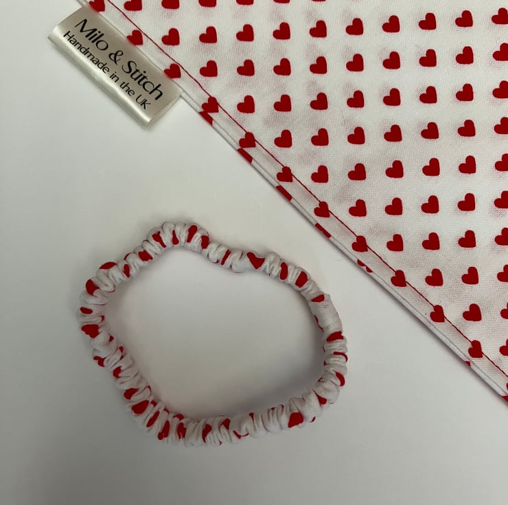 A small white dog bandana with vibrant red hearts, ideal for treating your furry friend this Valentine's. Paw-fectly suited for any occasion. It comes with a matching super skinny scrunchie, great for securing your as you take a stroll with your pup.