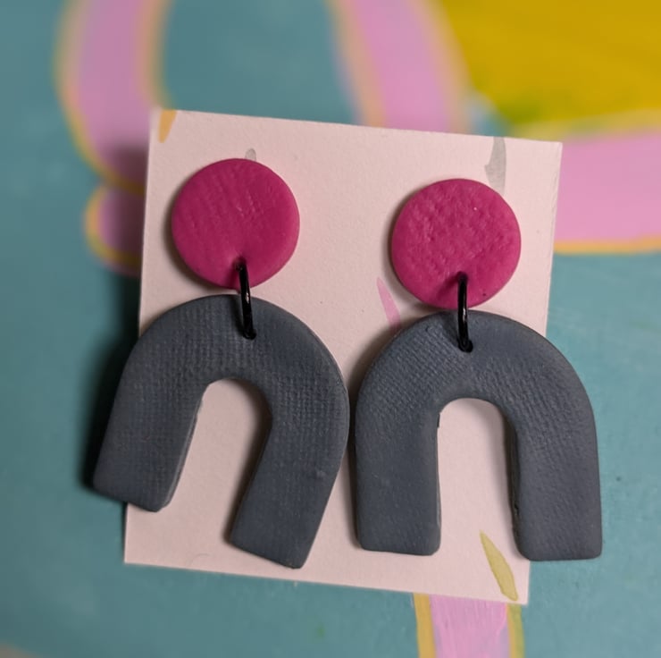 They feature large inverted U shape in a textured grey blue shade, above which is a contrasting bright pink textured disc. The 2 parts are connected with a black jump ring.