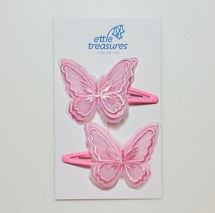 Handmade oversized fabric sewn Pink Butterflies, set on Pink snap hair clips.