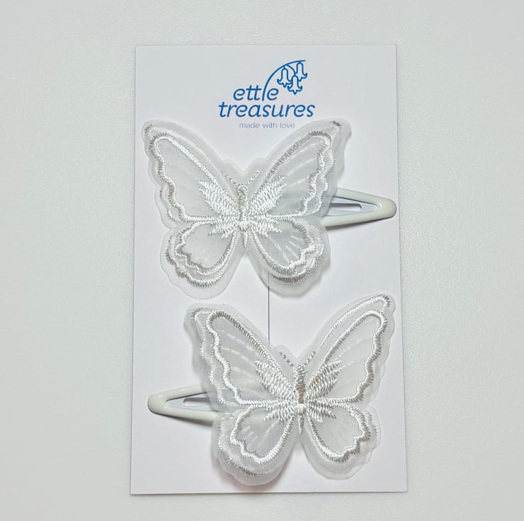 Handmade oversized fabric sewn White Butterflies, set on White snap hair clips.