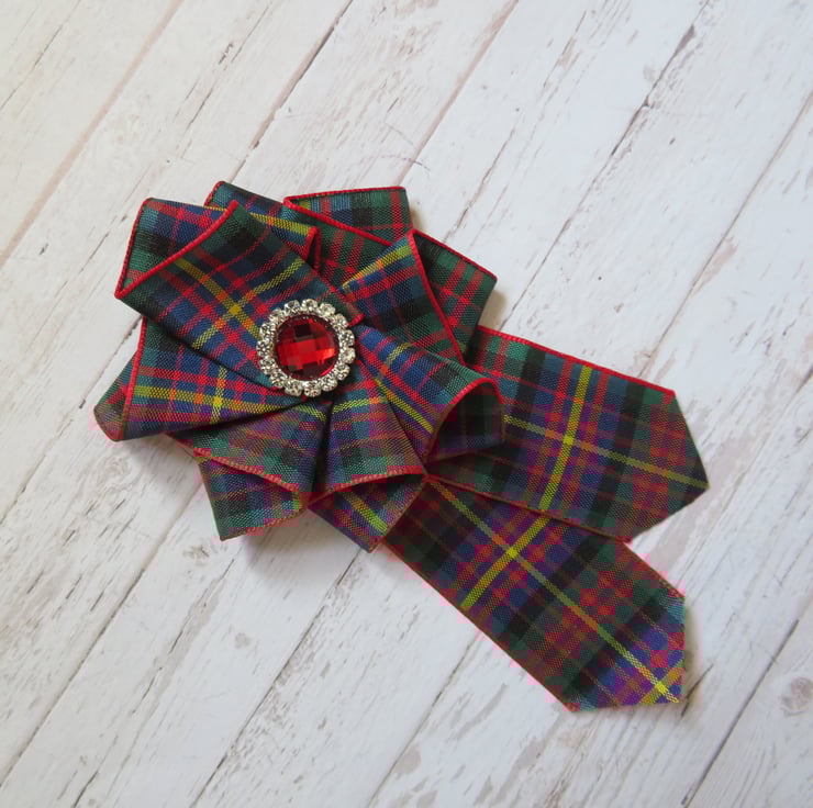 Made with a small circle of navy felt with a small brooch pin attached and a handmade and sewn ruffle of Cameron of Erracht tartan ribbon with wide ribbon shaped trails and finished with either a red round crystal, burgundy or ivory pearl and rhinestone cabochon or a silver or brass Celtic button.