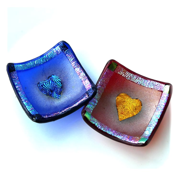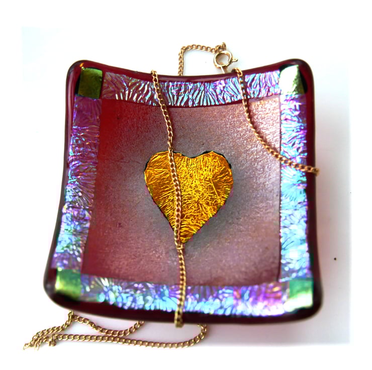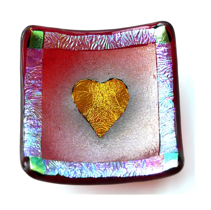 This little dish is on a base of bright red glass topped with a layer of clear but iridescent gold tinted glass . In the centre a big dichroic glass heart
