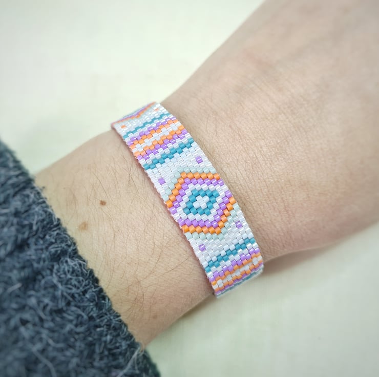 This unique bracelet was made using beautiful tiny Japanese glass beads called Miyuki Delica. There is a mix of matt and luster beads and it beautifully catches the light when worn.