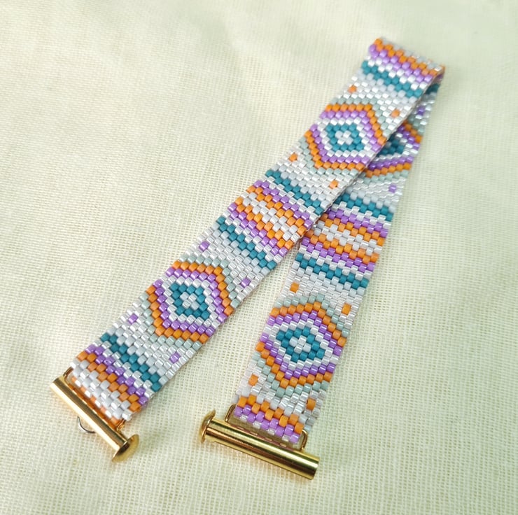 The beads are stitched together using strong, nylon thread with a Peyote stitch of my own design. It is finished with a stainless steel silver gold plated slide clasp for easy wear. The bracelet comes with a cute handmade pouch to store it in.