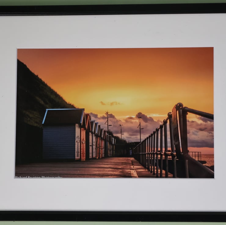 A beautiful Professionally printed image of the Beach Huts at Sheringham as the sun is setting. This is a 12 x 8 inch image, Mounted on an Acid free off-white Card and framed with a modern black frame, Final framed image is 16 x 12 inches.