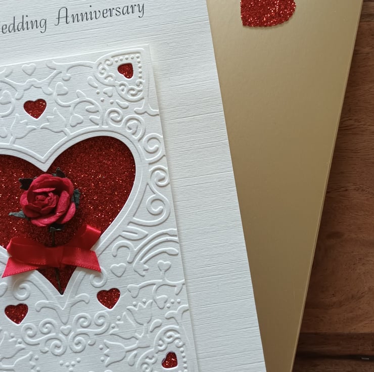 A beautiful, boxed Ruby Anniversary card for Husband or Wife. A red rose, embossed and sparkling hearts, raised from the card to give a 3D effect. Also with a red satin ribbon and bow down the edge of the card. Choose from a gold or Kraft box with a red scalloped sparkling heart in one corner.
