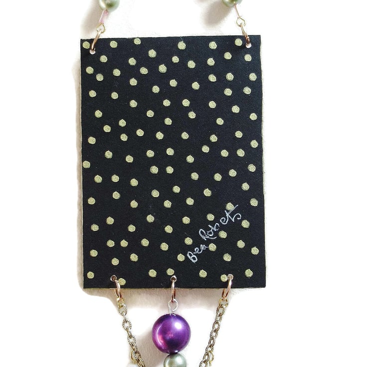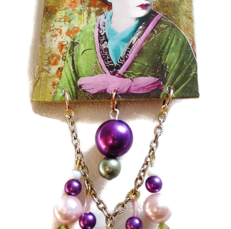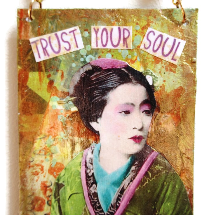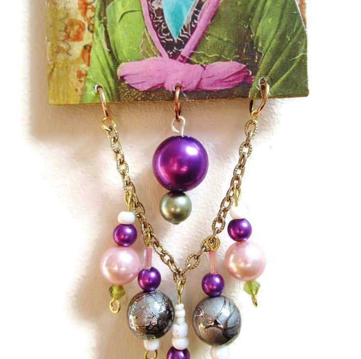 Striking inspirational hanging wall ornament in mixed media consisting of an original ACEO, in acrylic, collage and drawing pens embellished with beads and chains. The ACEO part measures 2.5 x 3.5 inches and the whole piece, including beads and hanger measures just over 9.5 inches. This would make the perfect original art gift for a friend, loved one .... or even for yourself!