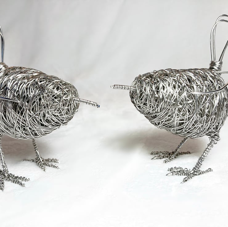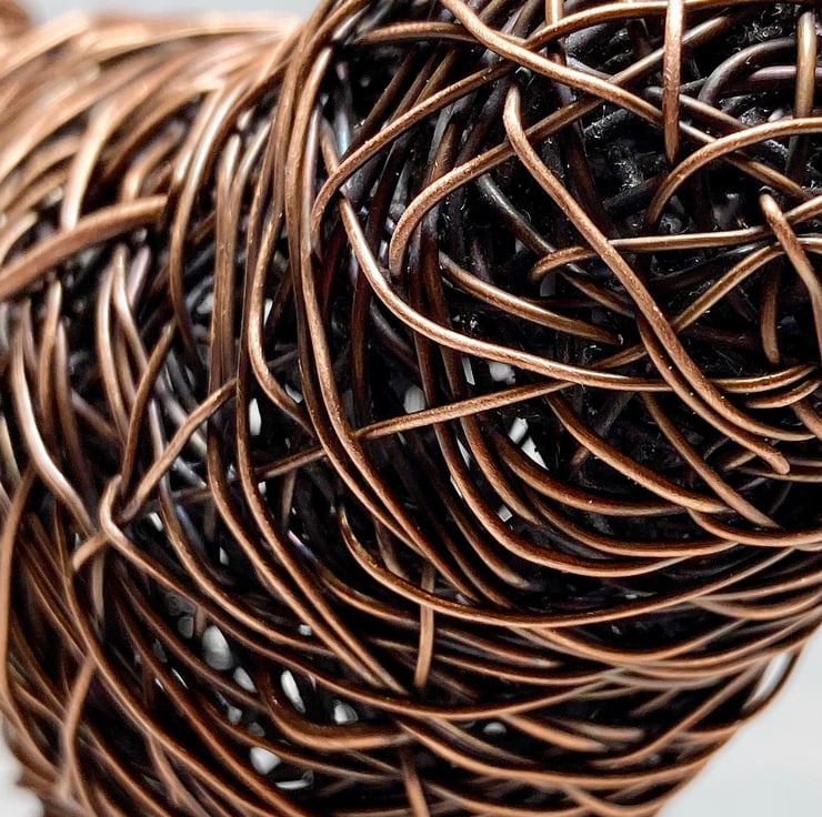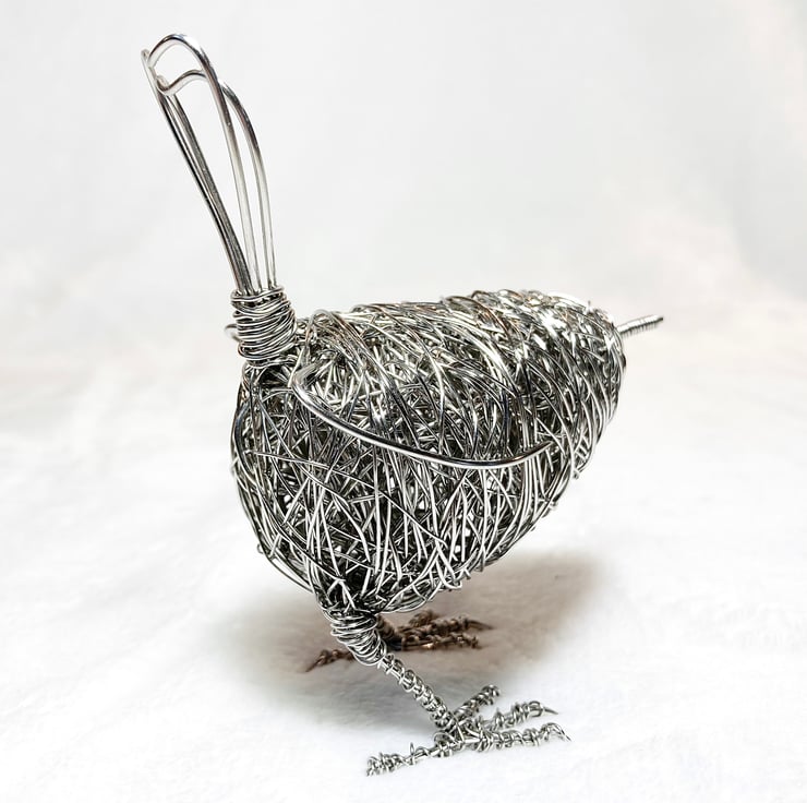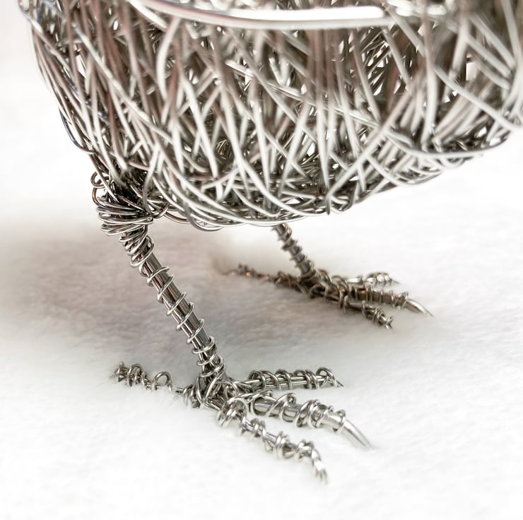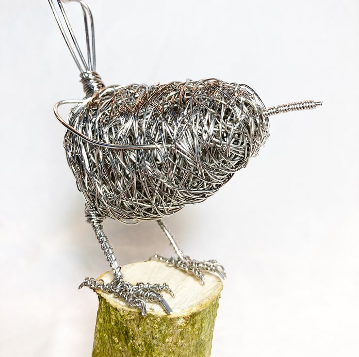 Wire is bound, layered and shaped by hand to create this intricate little wren.