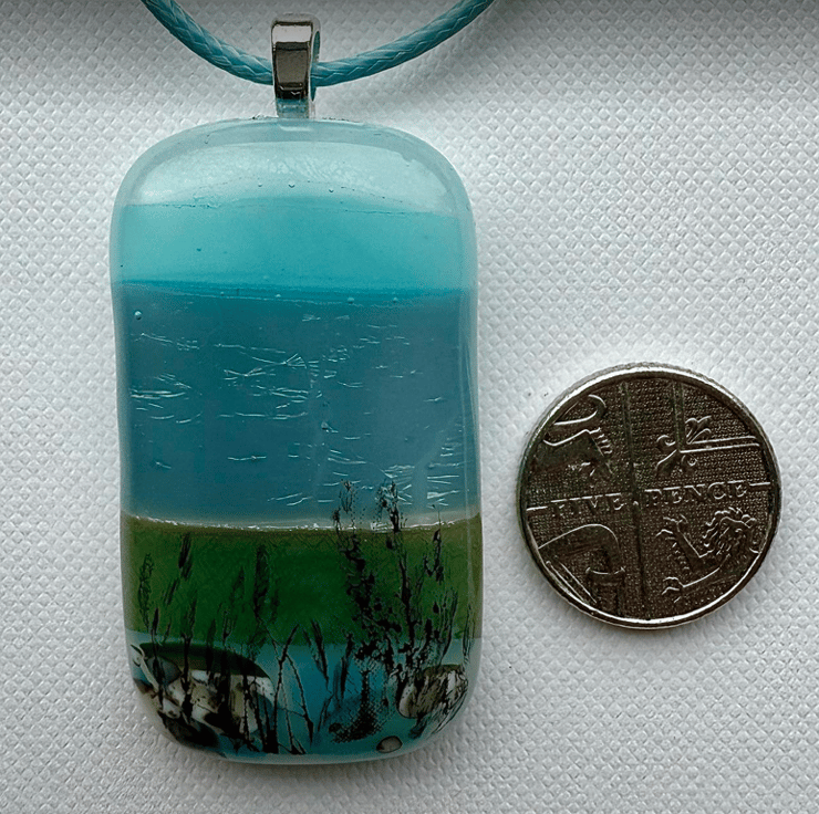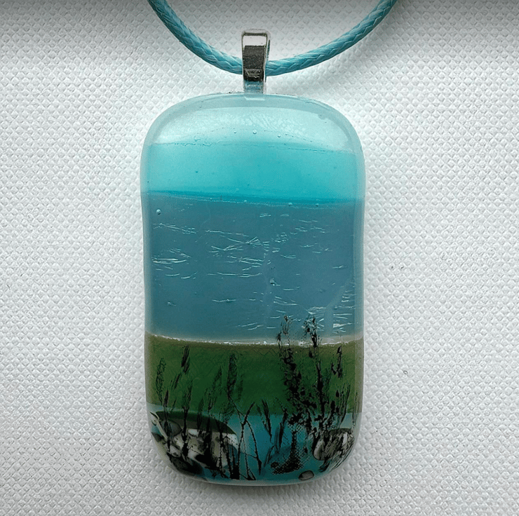 Fused glass pendant necklace depicting a seascape. Created by layering up narrow strips of carefully colour graded art glass to represent a rocky shore set before a sparkling sea and vivid blue sky. The strips were fused to a white base and kiln fused, then refined by hand-sanding before adding more detail to represent the grasses in the foreground and fusing again. A statement piece of costume jewellery, measuring 23 x 42mm, the pendant has a silver plated bail and adjustable black neck cord (adjustable between 17 - 19")