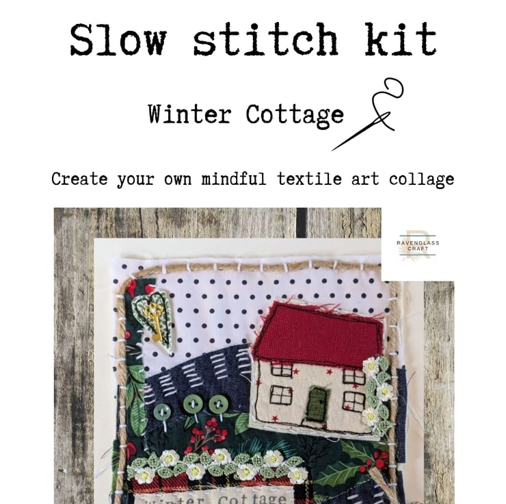 The Winter Cottage slow stitch kit includes all you need to create a wintery scene with a handmade cottage motif.