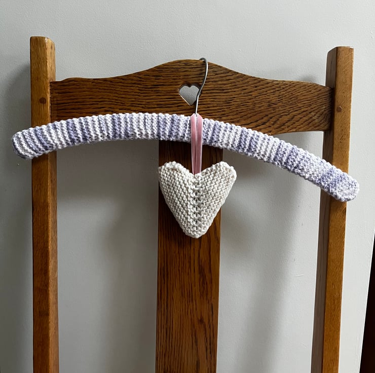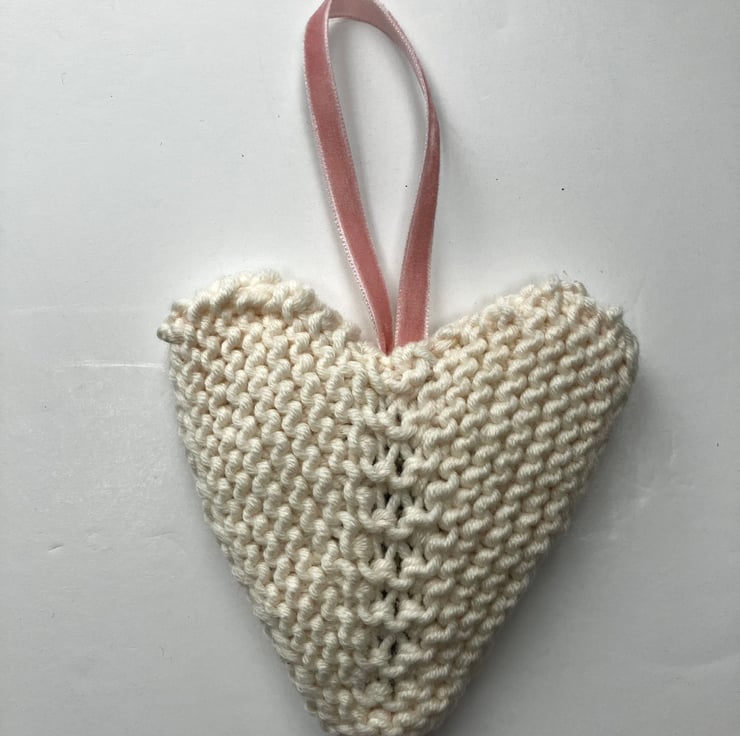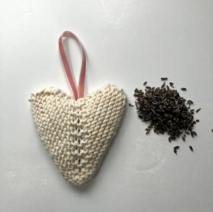 I’ve knit this heart using a pure merino wool in a cream shade. There is heart is lightly stuffed with lavender seeds grown in my garden and finished with a pretty pale pink velvet ribbon.
